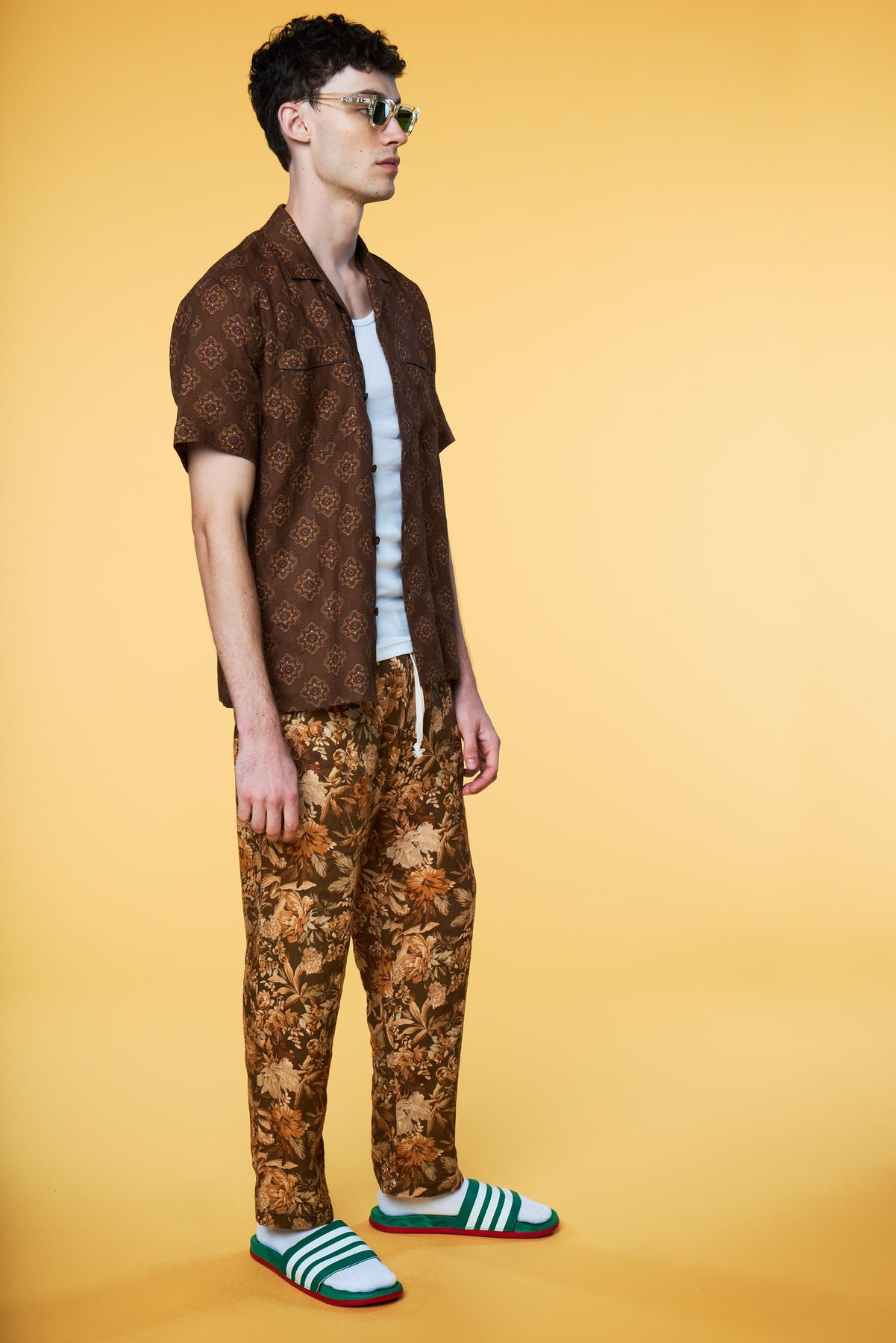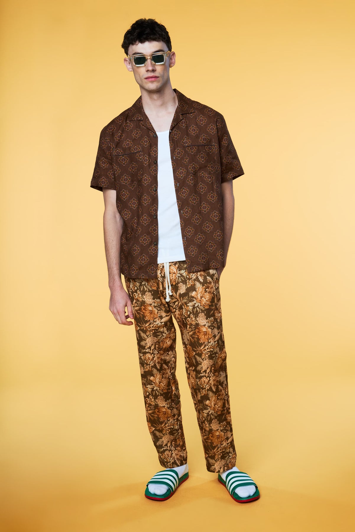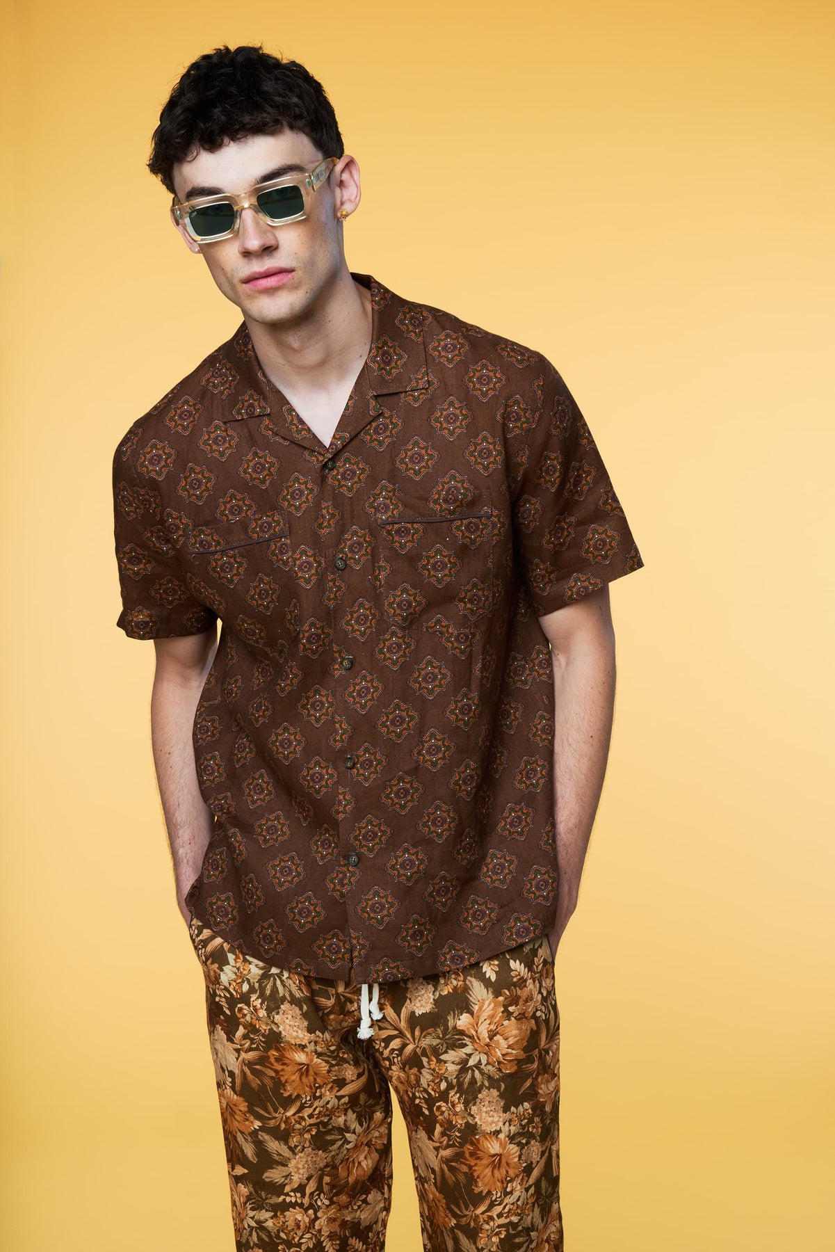 This Combination pairs our Short Sleeve Geo Print Camp Shirt in Brown with our Botanical Lounge Trouser in Olive. Model is 6'3, wearing a Size M Shirt with a Size M Trouser.