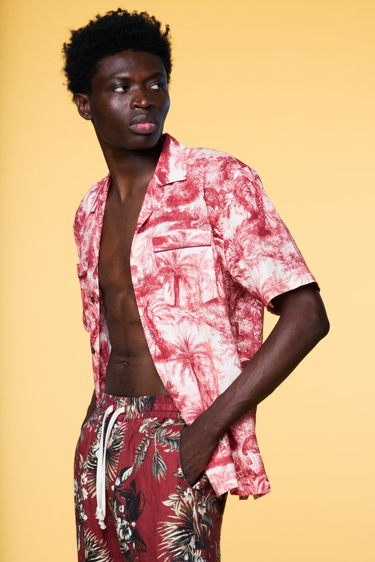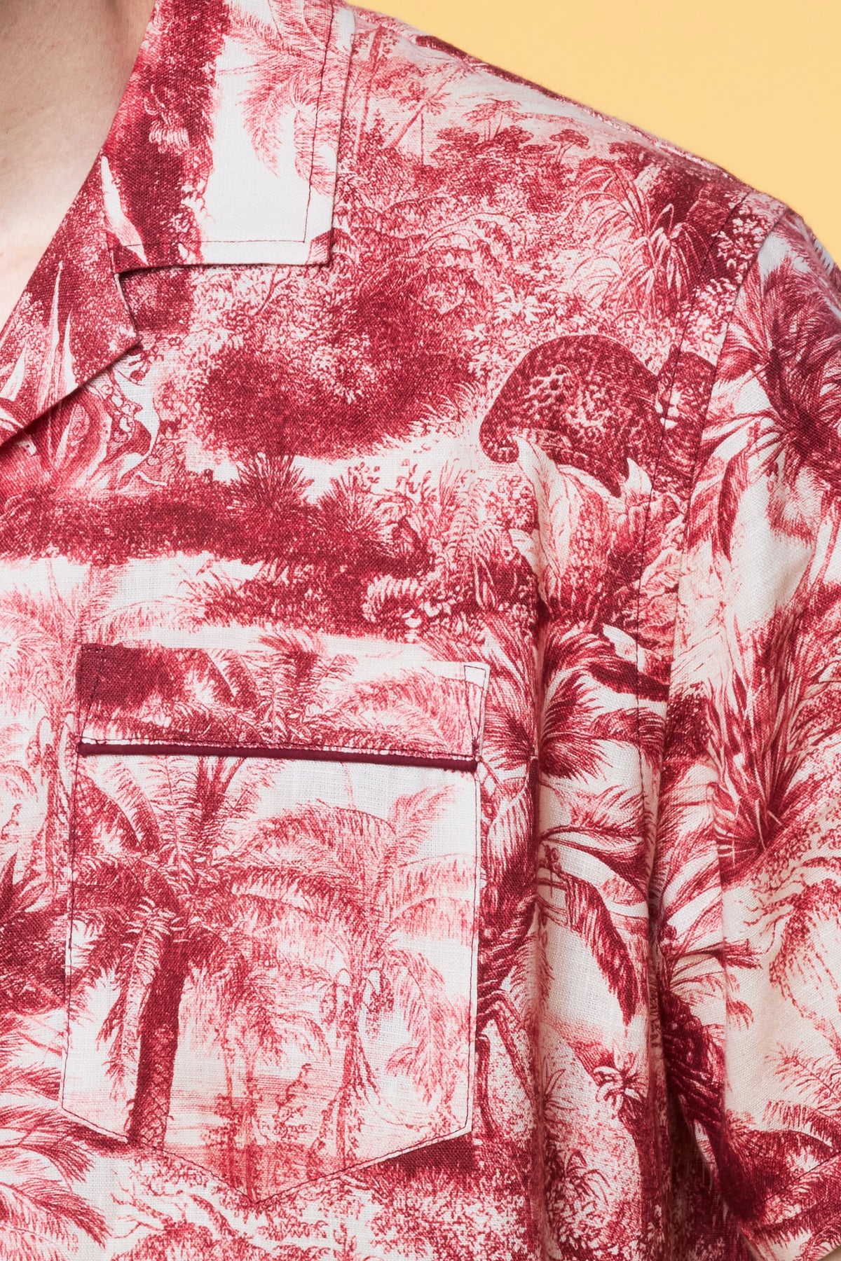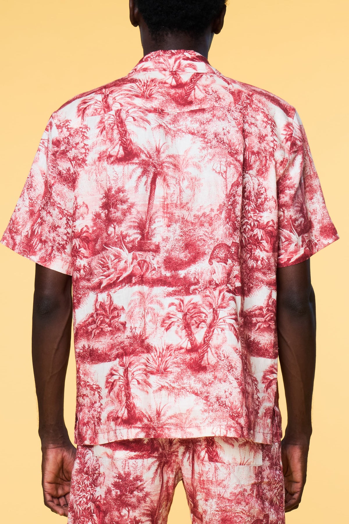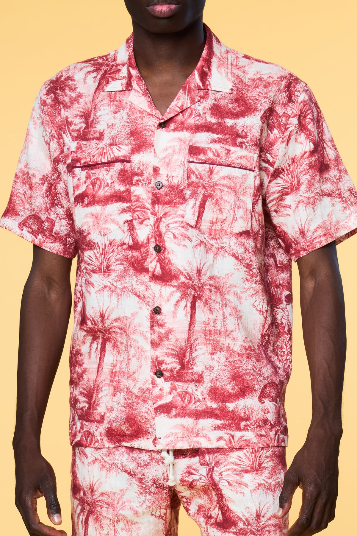 Our Tropical Toile design is a modern-day take of the 18th century 'Toile De Jouy' classic. Printed on our core luxe linen fabric, this intricately detailed jungle-scene short-sleeve shirt creates an intriguing conversational piece. Pair it with our Tropical Toile lounge trouser as a matching set or try our pairing recommendations. Female model is 5'10, wearing a Size S Shirt. Male model is 6'1, wearing a Size M Shirt.